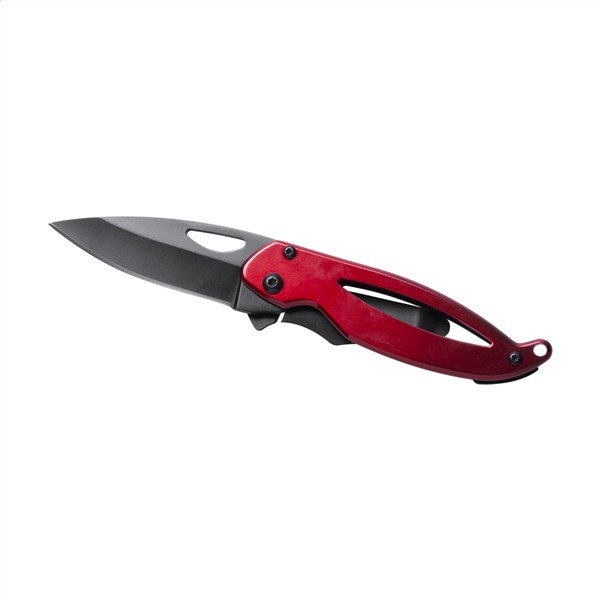 Metalowy nóż kieszonkowy z zabezpieczeniem.