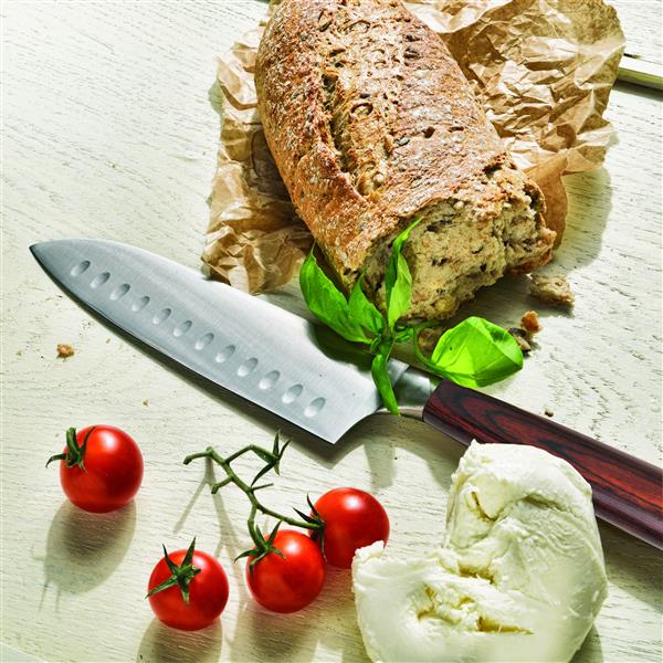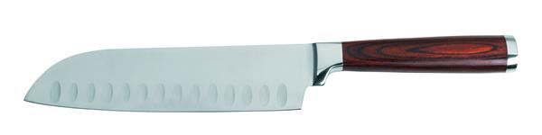 Ekskluzywny nóż kuchenny Santoku wykonany z niemieckiej stali. Nazwa `Santoku` oznacza `trzy zalety` lub `trzy zastosowania` i odnosi się do trzech głównych zadań, które ten nóż doskonale wykonuje – krojenia, siekania i rozdrabniania. Cienkie, bardzo ostre i gładkie ostrze zapobiega utracie soków podczas krojenia mięsa i owoców. Zapakowany w prezentowe pudełko Vanilla Season.