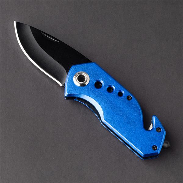 Wykonany z metalu 2CR13 składany nóż z ostrzem o długości 58 mm, blokadą ostrza, młotkiem do rozbicia szyb, przecinakiem do samochodowych pasów bezpieczeństwa i klipem do zaczepienia. Zapakowany w czarnym poliestrowym etui.