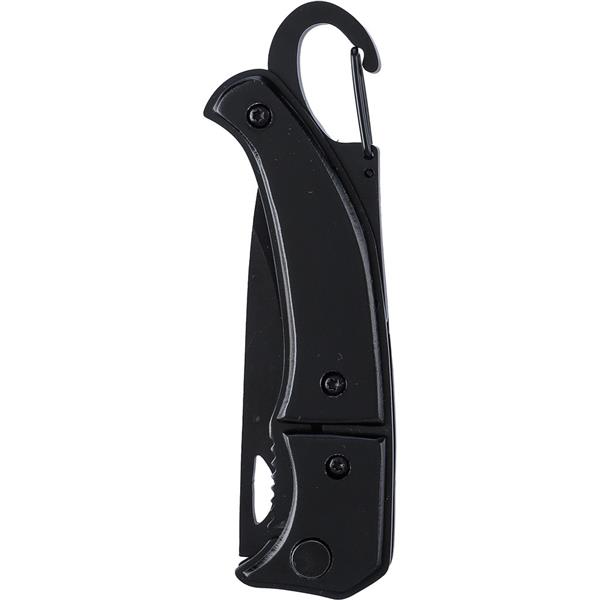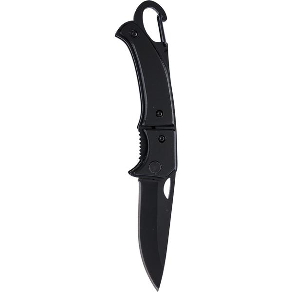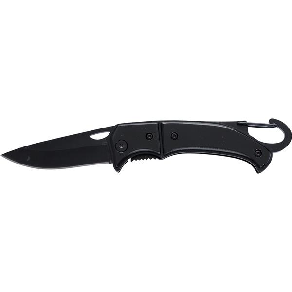 Nóż kieszonkowy z blokadą zabezpieczającą, z karabińczykiem w rękojeści umożliwiającym przypinanie, zapakowany w brązowy kartonik, produkt wykonany ze stali nierdzewnej