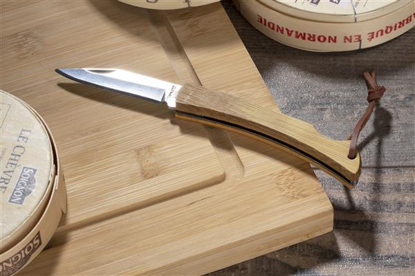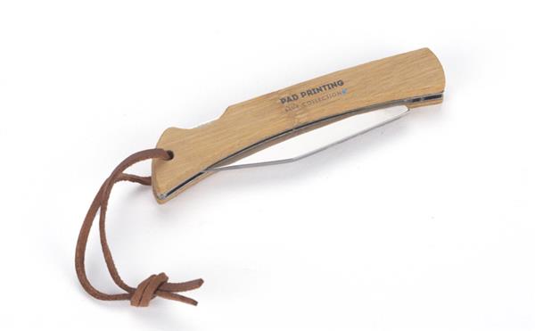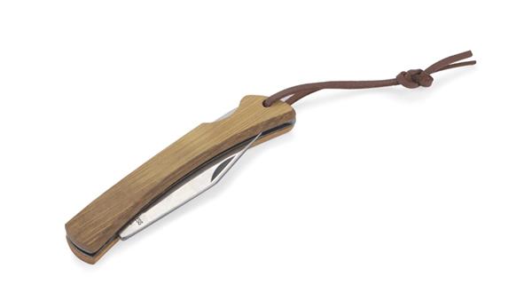 Wykonany z naturalnego drewna uchwyt wraz z rzemykowym paskiem zapewniają świetną ergonomię użytkowania. Zastosowana tylna blokada zapobiegnie niezaplanowanemu złożeniu się ostrza.