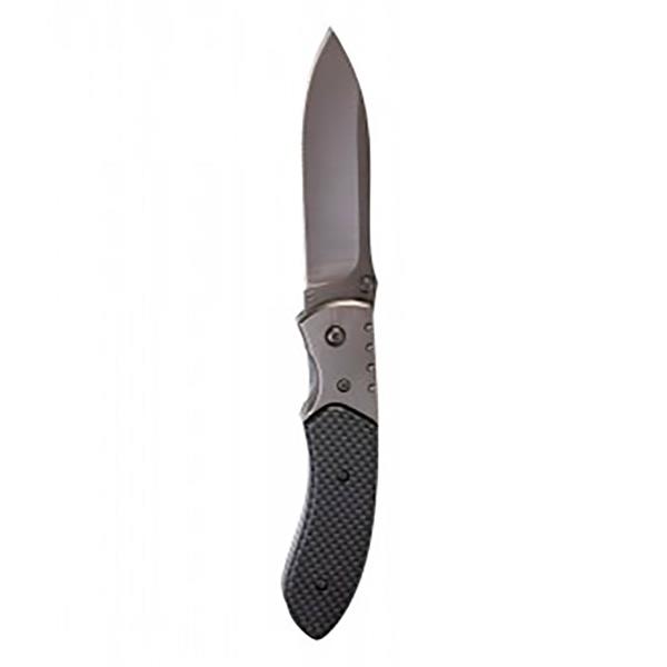 Kieszonkowy nóż ze sprzączką, wykonany z włókna węglowego i metalu.