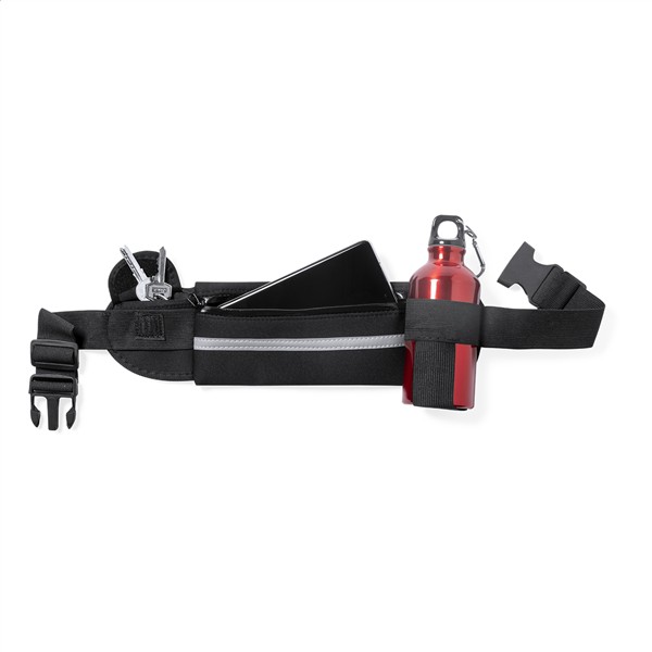 Torba biodrowa softshellowa z 1 przegrodą zapinaną na zamek, 1 małą kieszenią i elastycznym uchwytem na butelkę, odblaskową opaską i regulowanym paskiem. Produkt przeznaczony wyłącznie do celów promocyjnych nie kwalifikuje się jako sprzęt ochrony osobistej.
