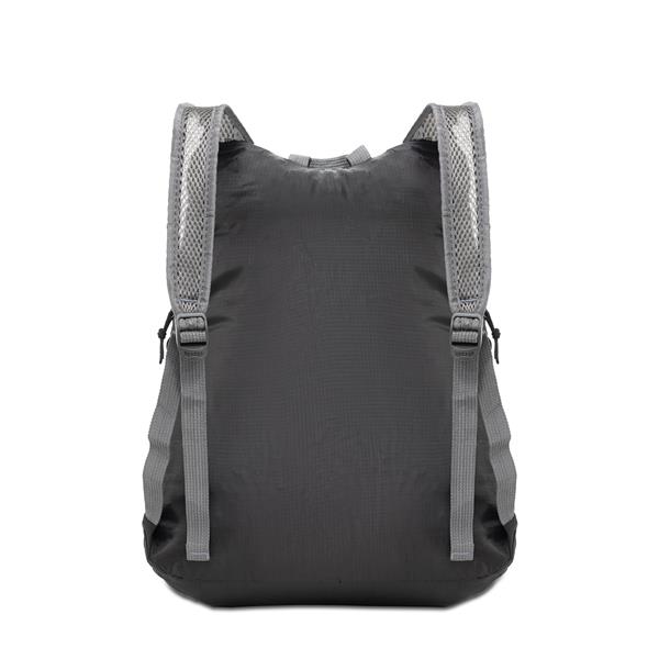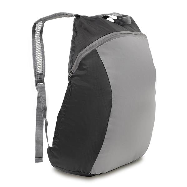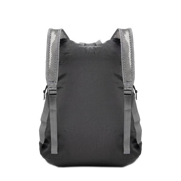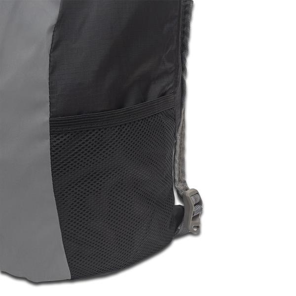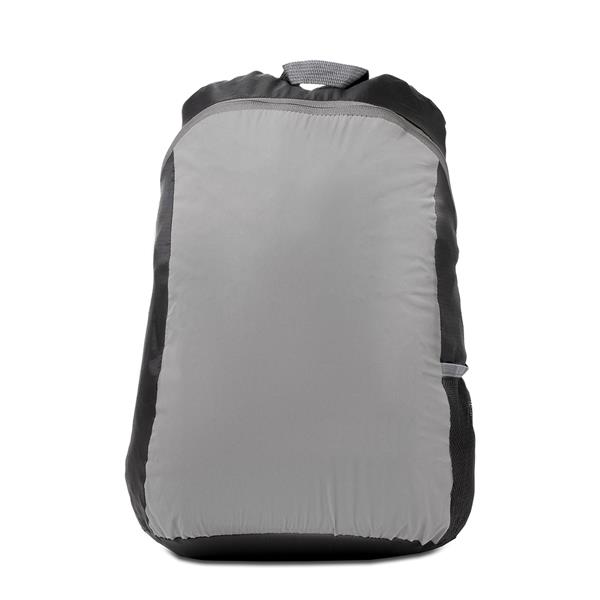 Lekki plecak z przednim panelem odbijającym światło i boczną kieszenią. Kompaktowy, można go spakować w małe etui (9×13 cm).