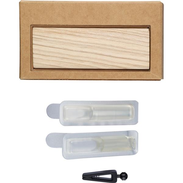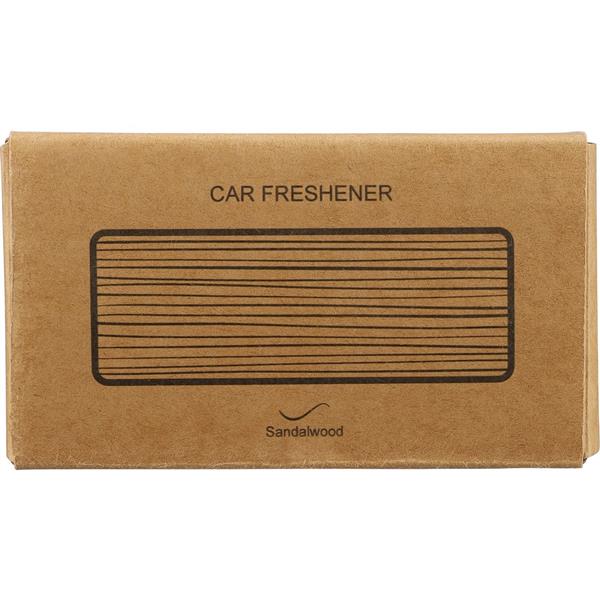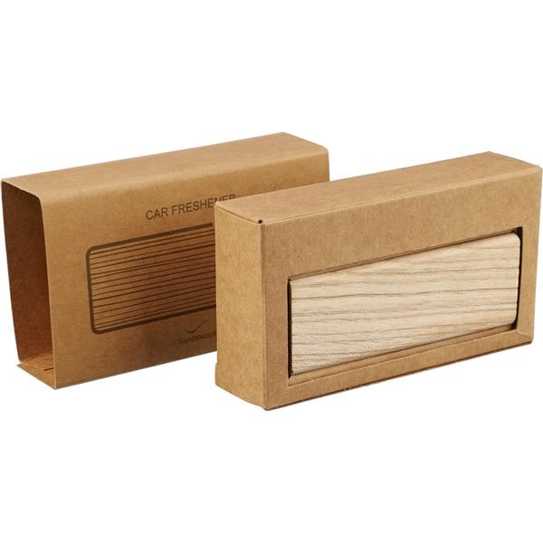 Odświeżacz do samochodu, 2 pojemniczki z zapachem drzewa sandałowego po 3 g, klips ułatwiający przypięcie w samochodzie, zapakowany pojedynczo w brązowy kartonik, produkt wykonany z drewna bukowego
