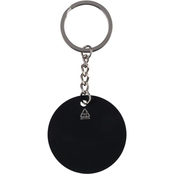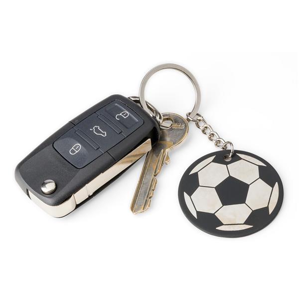 Okrągły brelok do kluczy w kształcie piłki nożnej, ikona recyklingu na produkcie, zapakowany w kraftową kopertę, produkt wykonany ze stali nierdzewnej z recyklingu