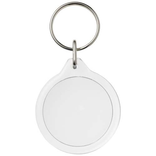 Okrągły breloczek I7 z metalowym pękiem na klucze. Metalowy pierścień cechuje płaski profil, który idealnie nadaje się do wysyłek. Średnica wkładu do druku: 3,3 cm.