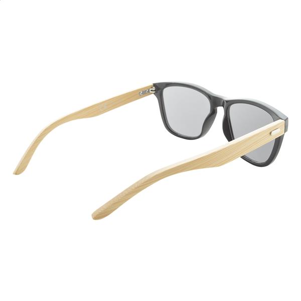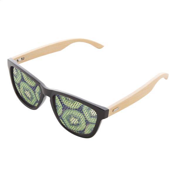 Plastikowe okulary przeciwsłoneczne z bambusowymi zausznikami i lustrzanymi soczewkami. Z ochroną UV 400.