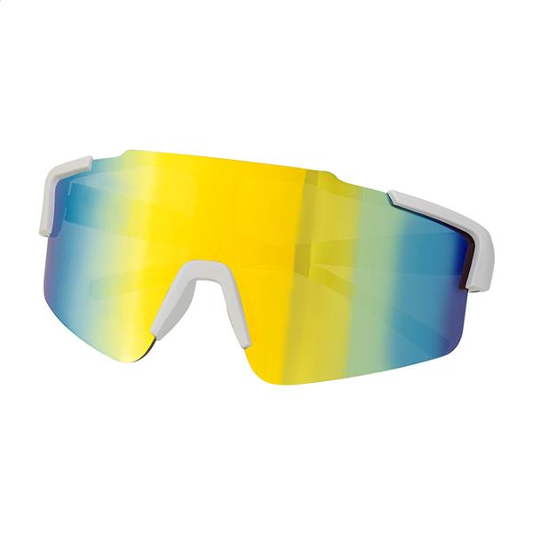 Okulary przeciwsłoneczne sportowe z recyklingowanego PC, z wielokolorowymi, lustrzanymi soczewkami jednoczęściowymi. Ochrona UV400.