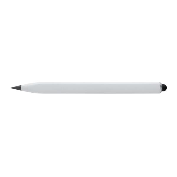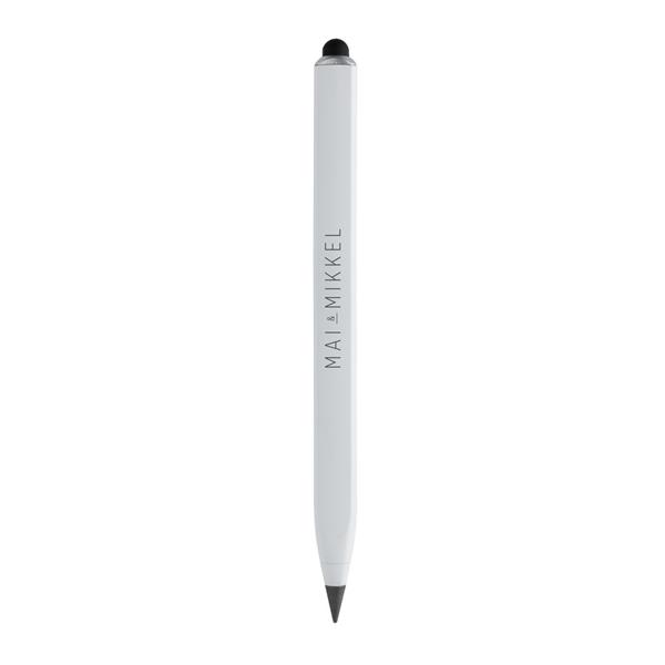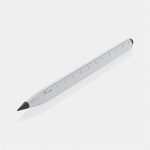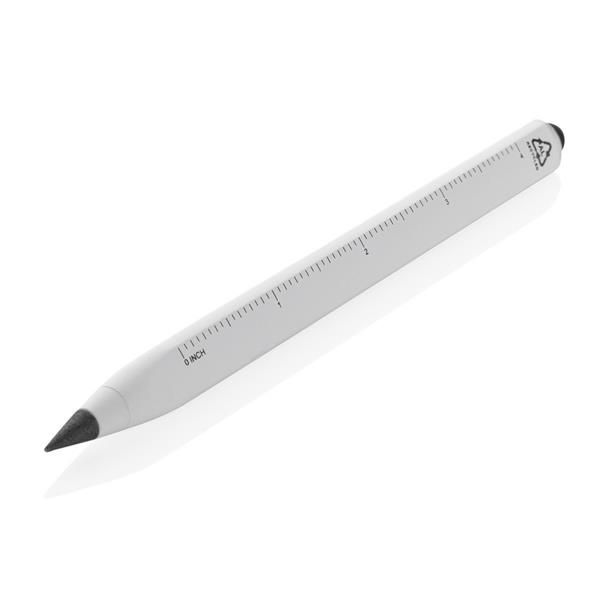 Ołówek, linijka, touch pen, wykonany aluminium z recyklingu, dzięki wykorzystaniu specjalnej wolnościerającej się grafitowej końcówki długość pisania ołówka to około 20 000 metrów w porównaniu z tradycyjnym ołówkiem którego długość pisania to około 200 metrów, notatki można zmazać standardową gumką do mazania, ślad węglowy produktu: 0,1 kg CO2