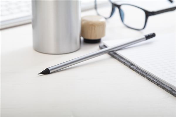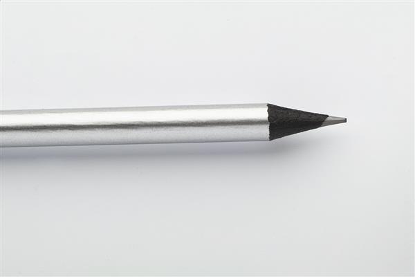 Ołówek z czarnego drewna w metalicznym wykończeniem, z czarną gumką. Zatemperowany, klasa HB.