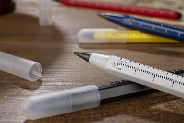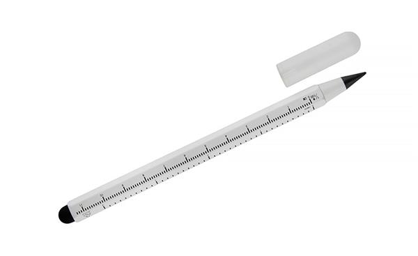 Ołówek wieczny DRAWI to praktyczny gadżet reklamowy wykonany z recyklingowanego aluminium z lakierowanym wykończeniem. Wyposażony w miarkę o długości 11 cm z podziałką w centymetrach i calach oraz touch pen, sprawdzi się w biurze, branży technicznej i budowlanej. Sześciokątny korpus zapewnia wygodny chwyt i zapobiega staczaniu się ołówka ze stołu. Zatyczka z tworzywa chroni końcówkę, co podnosi komfort użytkowania. Kompaktowy format sprawia, że DRAWI jest zawsze pod ręką i stanowi solidny nośnik reklamy dzięki możliwości znakowania.