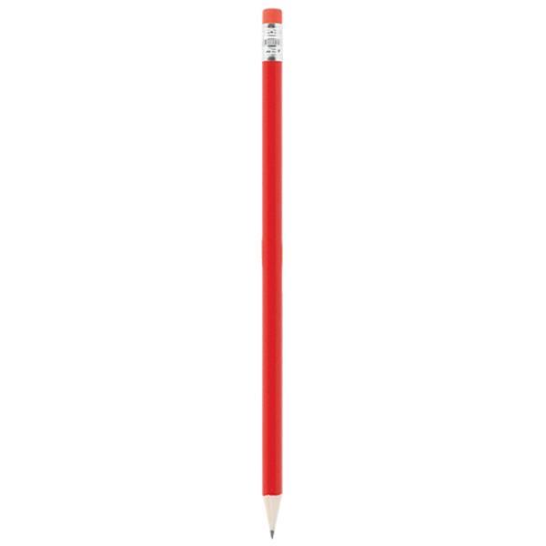 Drewnieny ołówek z gumką, zatemperowany. Rozmiar: 19,6 x 0,6 cm L1 (grawer laserowy): 7 x 0,4 cm T1 (tampodruk): 5 x 0,4 cm Kolor: Czerwony