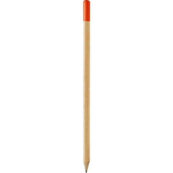 Uroczy ołówek w kolorze naturalnego drewna z kolorową końcówką, zatemperowany. Rozmiar: 17,5 x 0,7 cm T1 (tampodruk): 5 x 0,4 cm L2 (grawer laserowy): 5 x 0,4 cm Kolor: Pomarańczowy