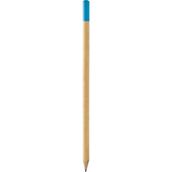 Uroczy ołówek w kolorze naturalnego drewna z kolorową końcówką, zatemperowany. Rozmiar: 17,5 x 0,7 cm T1 (tampodruk): 5 x 0,4 cm L2 (grawer laserowy): 5 x 0,4 cm Kolor: Sky Blue