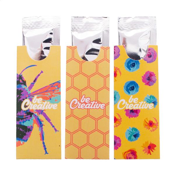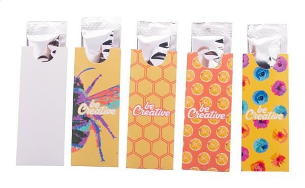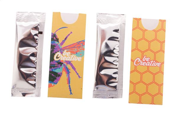 Description: Opakowanie miodu (10 gramów) w personalizowanym, papierowym rękawie z nadrukiem full kolor. Min. ilość: 100 szt. Primary Color: biały Material 1: Papier Rozmiar: 40×100 mm