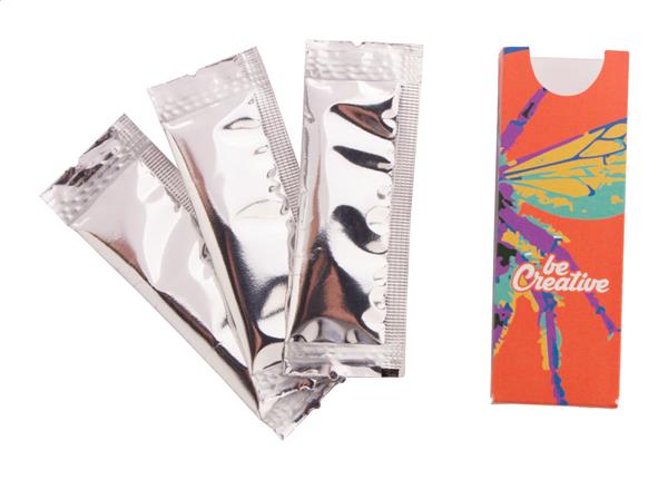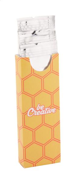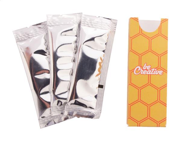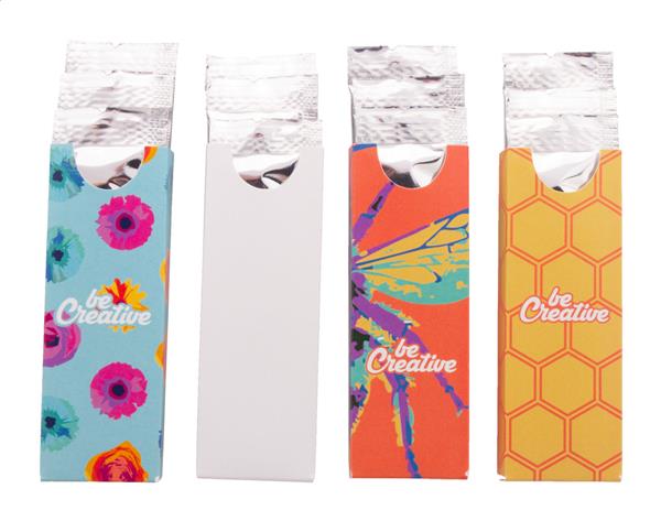 Description: 3 miody (3×10 gramów) w personalizowanych rękawach, z nadrukiem full kolor. Min. ilość: 100 szt. Primary Color: biały Material 1: Papier Rozmiar: 36×100×13 mm