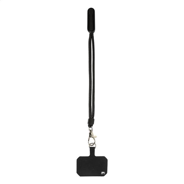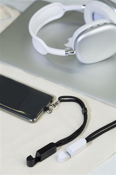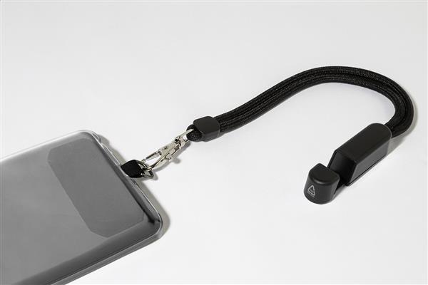 Opaska na nadgarstek wykonana z RPET, wyposażona w wkładkę na telefon oraz podstawkę na biurko wykonaną z recyklingowanego ABS.