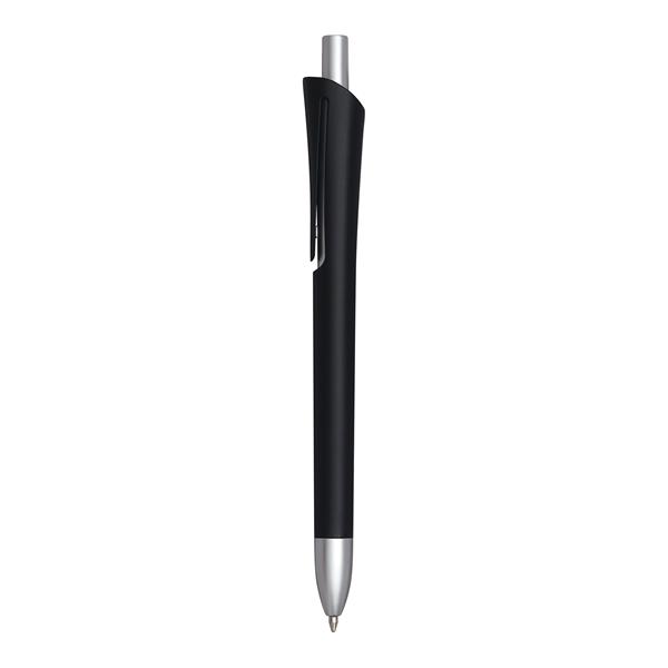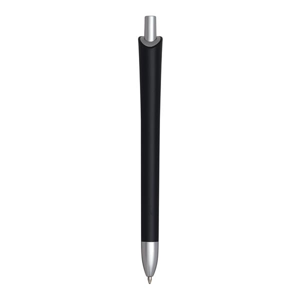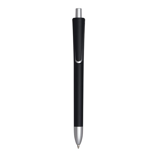 Długopis OREGON z mechanizmem przyciskowym, trzonkiem z tworzywa sztucznego, matowo-srebrnym akcentem pod klipem, na przycisku i obsadce, długość pisania około 800 – 1000 m, czarny tusz.