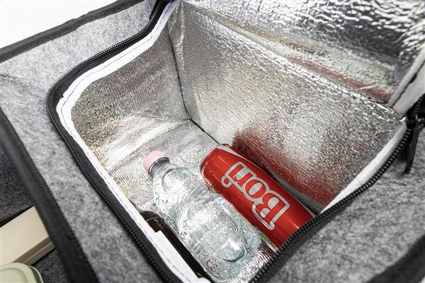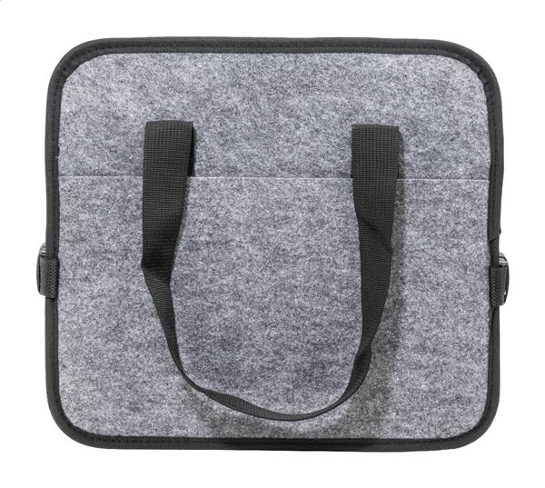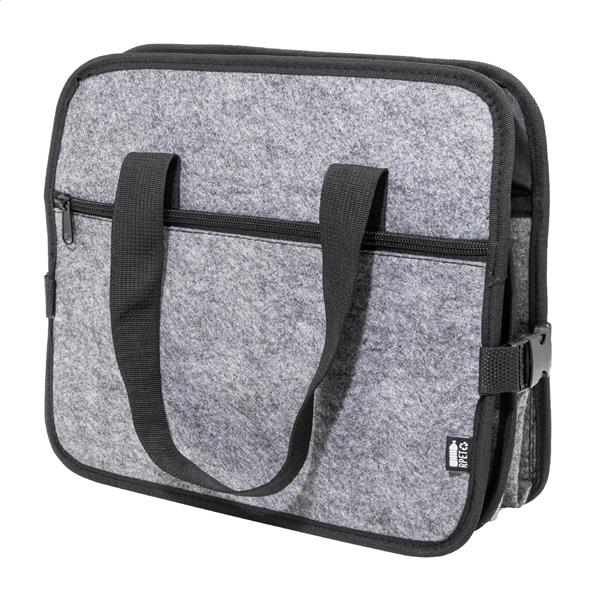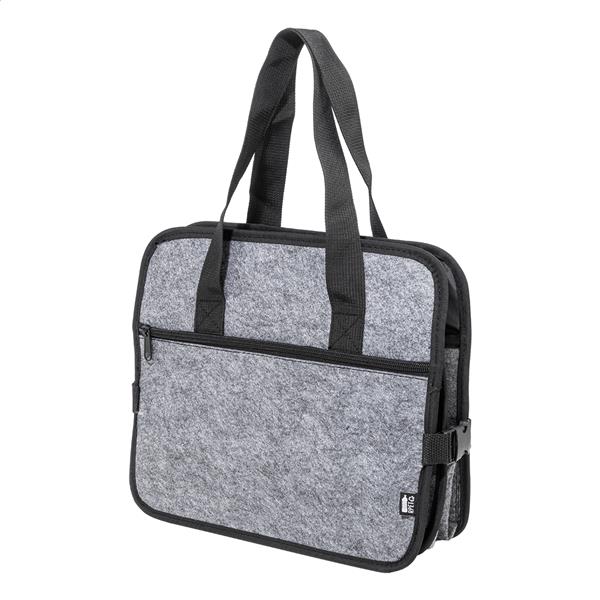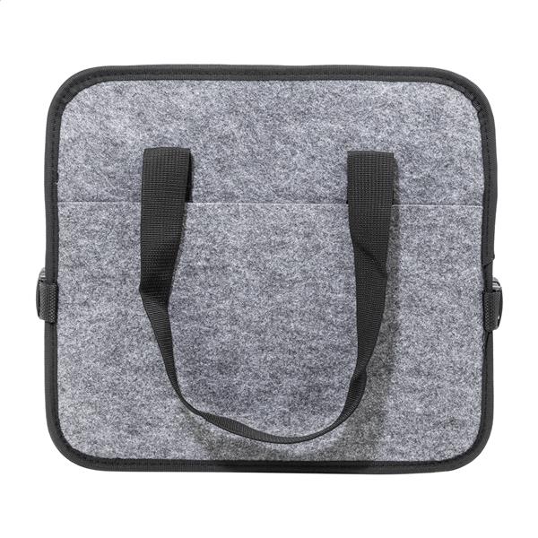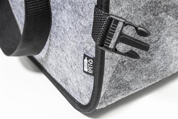 Składany organizer do bagażnika samochodowego z filcu RPET z kieszenią zapinaną na zamek błyskawiczny z przodu, długimi uchwytami i bocznymi klamrami dla wygodnego przechowywania. Zawiera jedną otwartą przegrodę do przechowywania i jedną przegrodę termiczną zapinaną na zamek błyskawiczny z aluminiową wyściółką. Z charakterystyczną metką RPET.