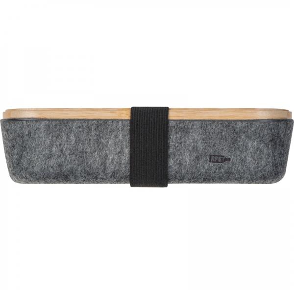 Etui na długopisy wykonane z filcu pochodzącego z recyklingu z bambusową pokrywką, mogącą służyć za podstawkę pod telefon. Pokrywka ma nadrukowaną miarkę. Etui po nałożeniu pokrywki i spięciu gumką może służyć za piórnik.