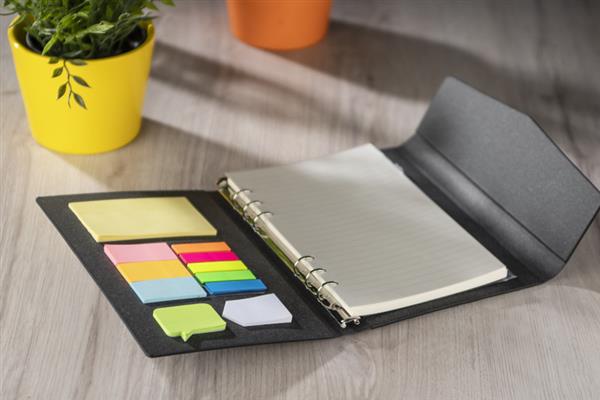 Organizer NOTI zawiera 60 kartek w linie z możliwością ich wymiany. Dzięki temu produkt posłuży na długi czas. Wewnątrz znajdują się kolorowe karteczki samoprzylepne, a także transparentna kieszonka zamykana na suwak do przechowywania artykułów biurowych, wizytówek czy na przykład maseczki ochronnej. Okładka zamykana na magnes, wykonana z papieru.