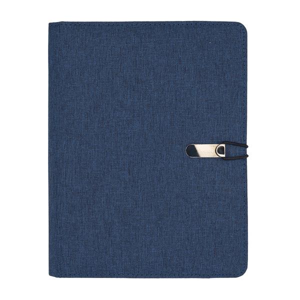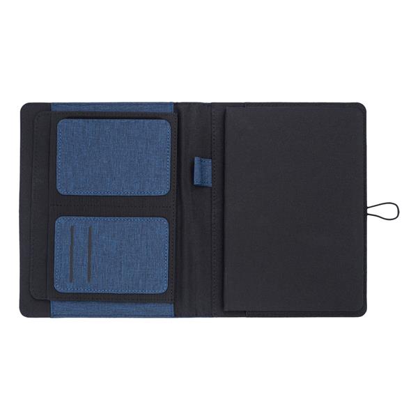 Organizer z wymiennym notesem A5 (64 kartek w kratkę, 70g/m2). Twarda okładka wykonana z tkaniny RPET. Organizer zawiera jedną dużą przegrodę, 3 mniejsze kieszonki, kieszonkę na wizytówki oraz uchwyt na długopis. Teczka zapinana jest na gumkę zaczepianą o metalowy haczyk.