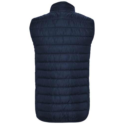 Gilet vest with feather touch filling. Inverted zips with matching chin protector and puller. Two side pockets with zip. Elastic trim in hem and armholes. Contrasting inner lining. Light and foldable garment. Water resistant. Wind-proof model.