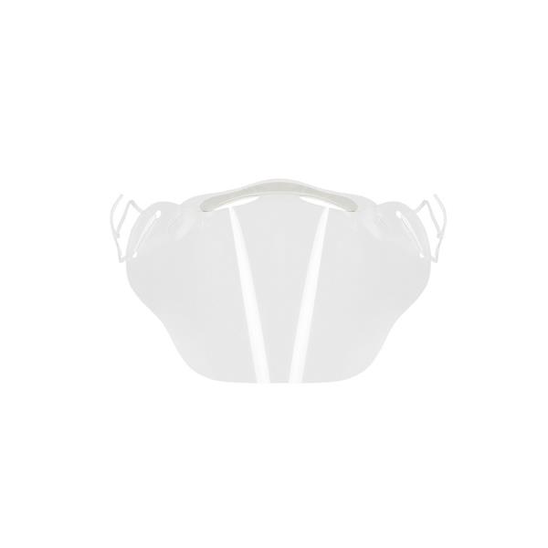 Osłona na nos i usta z elastycznymi mocowaniami, wielokrotnego użytku, wykonana z przezroczystego tworzywa PET, łatwa do dezynfekcji po każdym użyciu, łatwa w montażu, możliwość dopasowania długości gumek, duże otwory umożliwiające łatwą wymianę gumek, odpowiednio wyprofilowana pod okulary, posiada otwory zapobiegające parowaniu okularów, szeroki nosek z pianki poliestrowej dla większego komfortu użytkowania (wyprodukowana w Europie / made in Europe)
