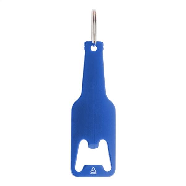 Otwieracz do butelek z aluminium pochodzącego z recyklingu w kształcie butelki z metalowym kółkiem na klucze.