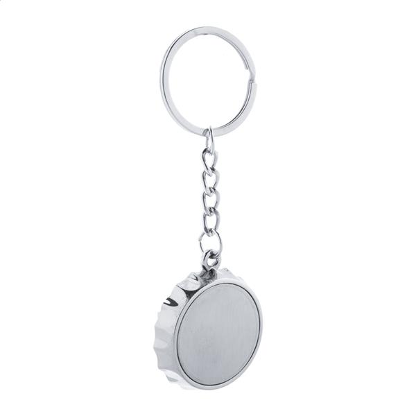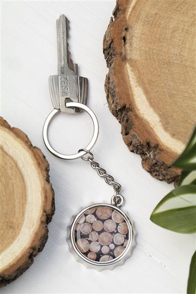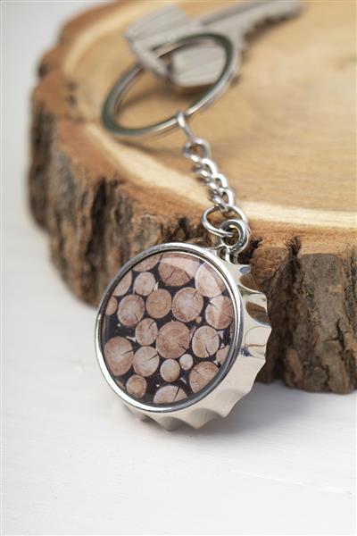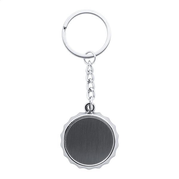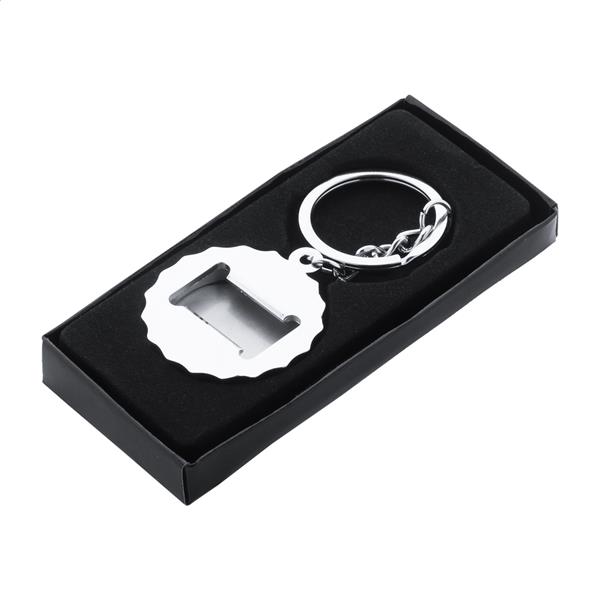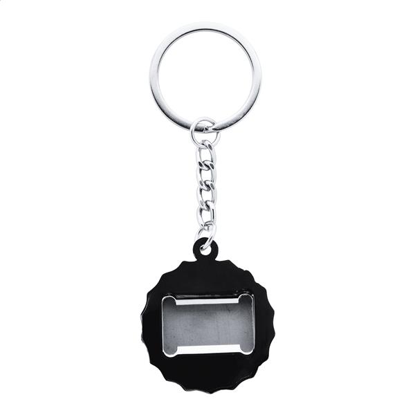 Metalowy brelok w kształcie kapsla z otwieraczem do butelek. W czarnym pudełku upominkowym. Idealny do nadruku epoksy doming.