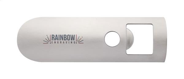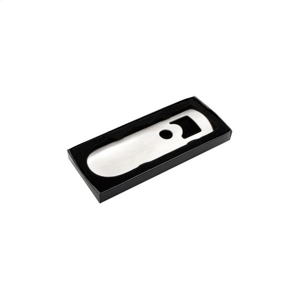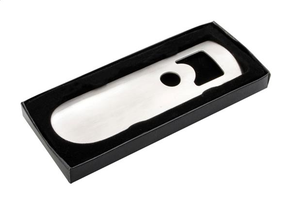 Metalowy otwieracz do butelek w czarnym pudełku.