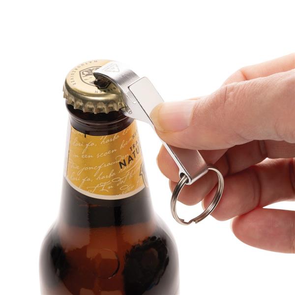 Otwieracz do butelek i puszek, wykonany z aluminium z recyklingu, całkowita zawartość materiałów z recyklingu obliczona w oparciu o wagę całkowitą przedmiotu: 79%