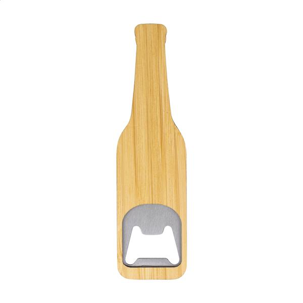 Otwieracz w kształcie butelki, wykonany ze stali nierdzewnej i elementami z bambusa.