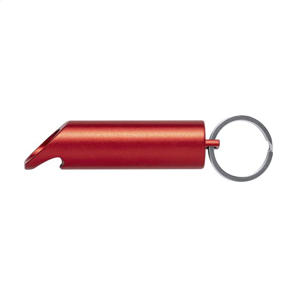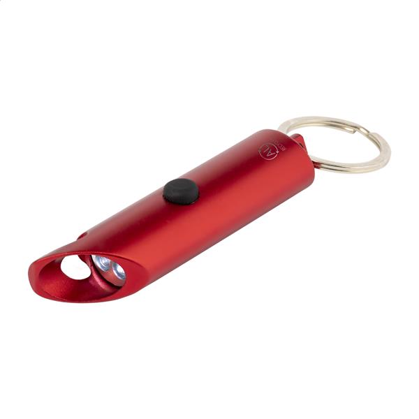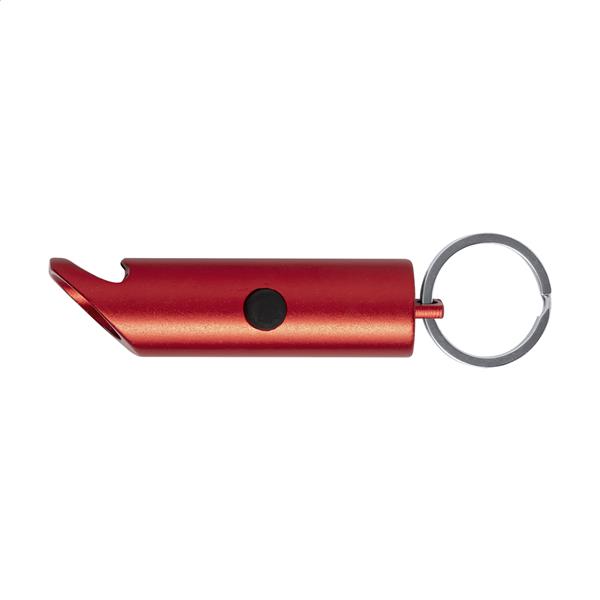 Mini latarka z aluminium pochodzącego z recyklingu, z 3 diodami LED, otwieraczem do butelek i brelokiem. Z baterią guzikową.