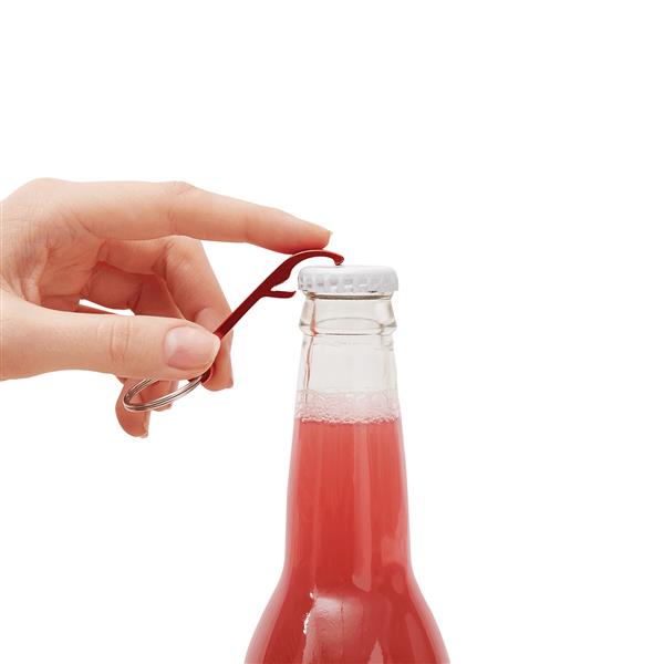 Otwieracz do butelek OPEN z kółkiem na klucze. Materiał: Aluminium/Żelazo Kolor: czerwony Tagi: otwieracze/zakrętki do butelek,artykuły gospodarstwa domowego,breloczki/smycze