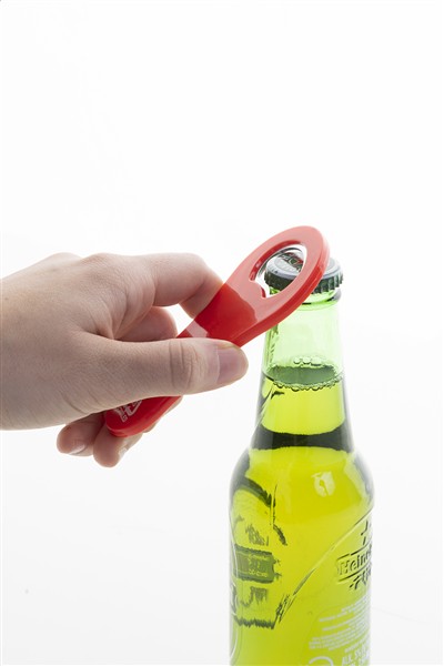 Otwieracz do butelek wykonany z recyklingowanego plastiku ABS z magnesem na lodówkę.