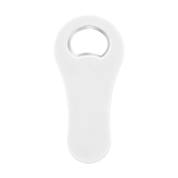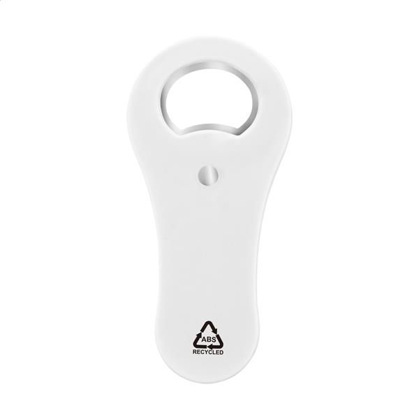 Otwieracz do butelek wykonany z recyklingowanego plastiku ABS z magnesem na lodówkę.