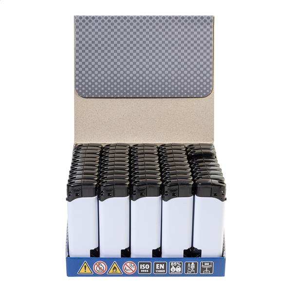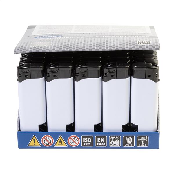 Plastikowa zapalniczka piezoelektryczna z możliwością ponownego napełnienia i otwieraczem do butelek. Zabezpieczona przed dziećmi. Dostarczana z poziomem gazu ok. 80%. Dostępna tylko w pełnych kartonach eksportowych (wielokrotność 500 sztuk)! Primary Color: biały Material 1: Plastik Rozmiar: 25×80×10 mm