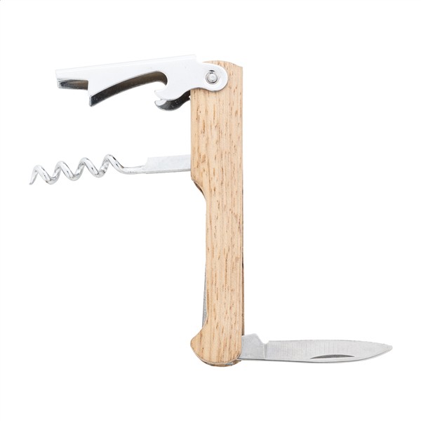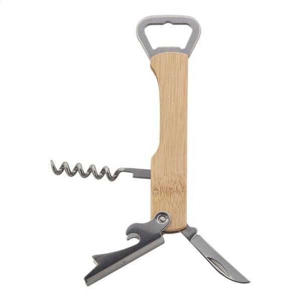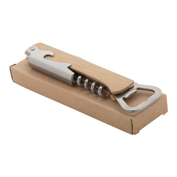 Otwieracz do butelek i korkociąg ze stali nierdzewnej z bambusową obudową.