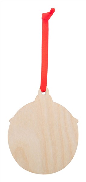 Drewniana ozdoba choinkowa ze sklejki brzozowej, z nadrukowanym motywem świątecznym i czerwoną wstążką. Dostarczana z odpiętą tasiemką.