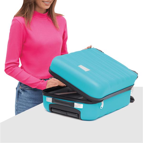 Walizka podróżna na kółkach PADUA z możliwością pakowania z obu stron. Wyściełane wnętrze z przegrodą zamykaną na zamek i paskami do pakowania, wysuwany uchwyt teleskopowy, uchwyt do podnoszenia, 4 gładko jeżdżące koła, zamek szyfrowy. Rozmiar odpowiedni dla tanich linii lotniczych. Materiał: ABS Kolor: turkusowy Tagi: Wózki,walizki,bagaże,akcesoria podróżne
