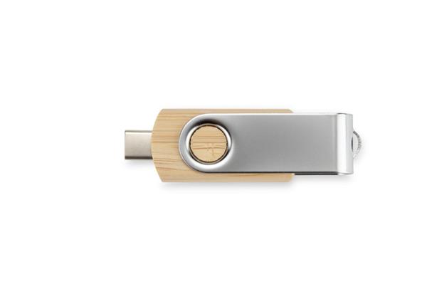 Pamięć USB TWISTER-PRO 32 GB to praktyczny gadżet reklamowy z obudową z bambusa i dwoma złączami: USB-A oraz USB-C. Dzięki standardowi USB 3.0 umożliwia szybki transfer danych, a funkcja OTG pozwala na bezpośrednie podłączenie do kompatybilnych smartfonów i tabletów. Naturalne wykończenie i nowoczesna funkcjonalność czynią z niego idealny nośnik reklamy dla marek stawiających na mobilność i estetykę.
