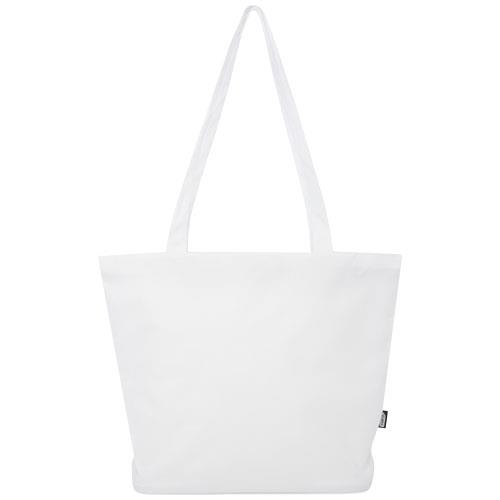 Panama zapinana na zamek błyskawiczny torba z wodoodpornego materiału RPET 600D z recyklingu z certyfikatem GRS to trwała, wielofunkcyjna torba na zakupy, która idealnie nadaje się na imprezę, plażę lub zakupy spożywcze. Posiada główną komorę zapinaną na zamek błyskawiczny oraz wewnętrzną kieszeń zapinaną na zamek błyskawiczny, która jest wystarczająco duża, aby pomieścić telefon i inne cenne rzeczy. Uchwyty mają długość 34 cm, dzięki czemu torbę można łatwo nosić na ramieniu. Wytrzymałość do 10 kg. Wolne od PVC.