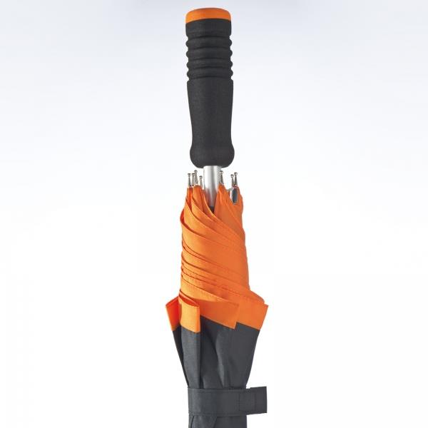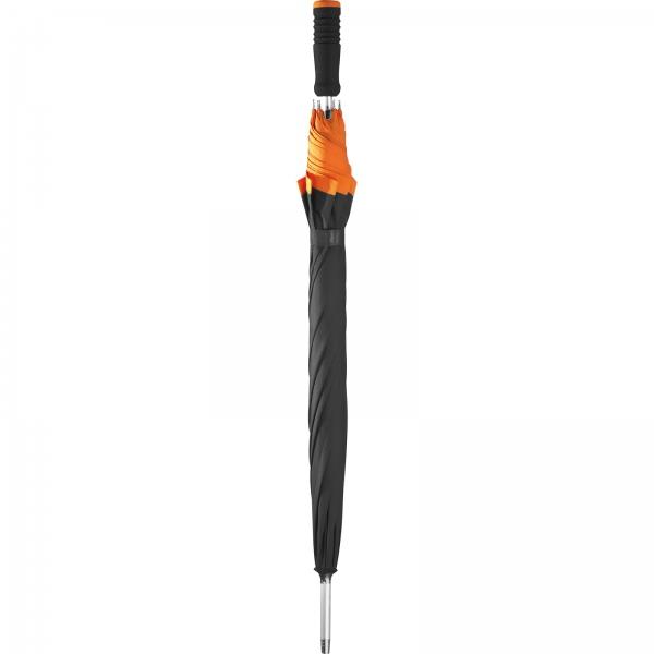 Elegancki parasol automatyczny wykonany z PU, metalu i materiału pongee. Parasol posiada miękki, prosty uchwyt.