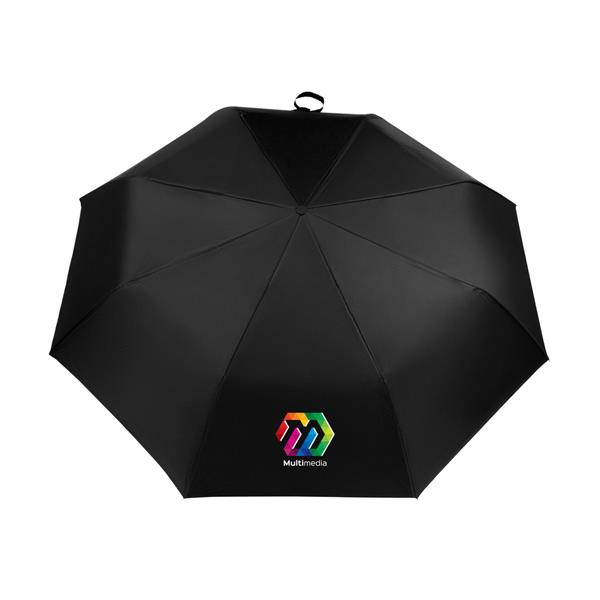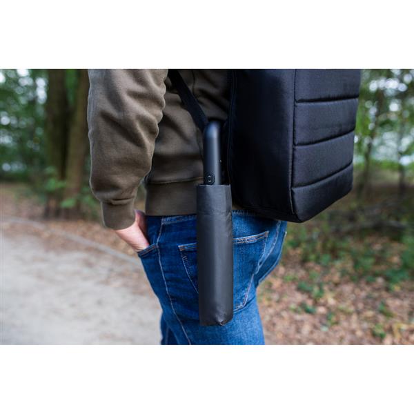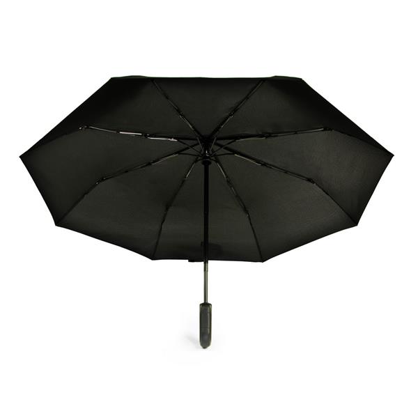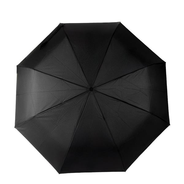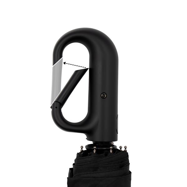 Parasol automatyczny, posiada 8 paneli oraz plastikową rączkę z przyciskiem i karabińczykiem umożliwiającym przypinanie, funkcja automatycznego otwierania i składania, zapięcie na rzep, czarny pokrowiec w komplecie, produkt wykonany między innymi z pongee 180T