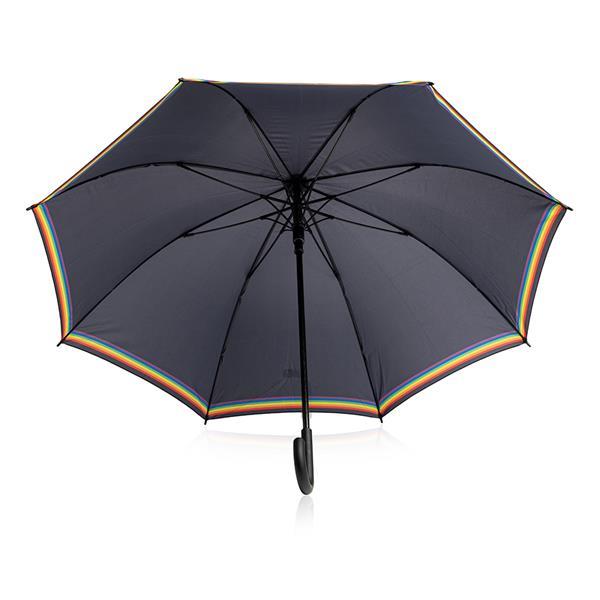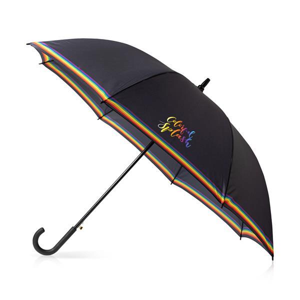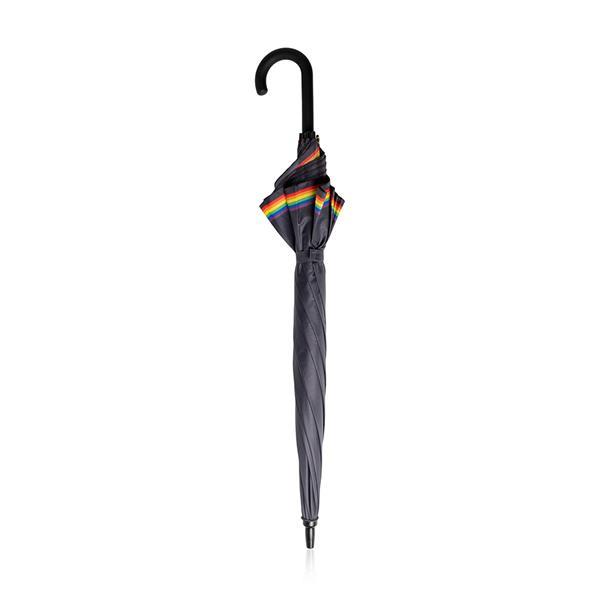Parasol automatyczny z kolorowymi akcentami wykonany z pongee 190T Rozmiar: 93 x 137 cm S2 (sitodruk): 20 x 15 TT2 (termotransfer): 15 x 10 Kolor: Czarny