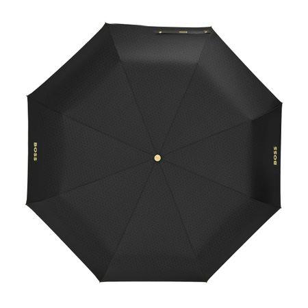 Kieszonkowy parasol Double B w kolorze czarnym ze złotymi metalowymi akcentami prezentuje logo BOSS Double B w trójwymiarowym wykonaniu, wzmocnione luksusowym metalicznym poszyciem na końcówkach rączki. Wyposażony w miękką, gumową teksturę uchwytu i subtelną, ton w ton czaszę z monogramem, ten parasol jest zarówno praktyczny, jak i elegancki. Stelaż jest lekki i kompaktowy, a podwójny automatyczny system otwierania i zamykania zapewnia płynną obsługę. Wysokiej jakości, wodoodporna czasza jest uzupełniona wyrafinowanym pokrowcem zapinanym na zamek błyskawiczny z grawerowanymi wykończeniami BOSS dla wygodnego przenoszenia.