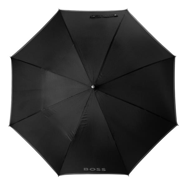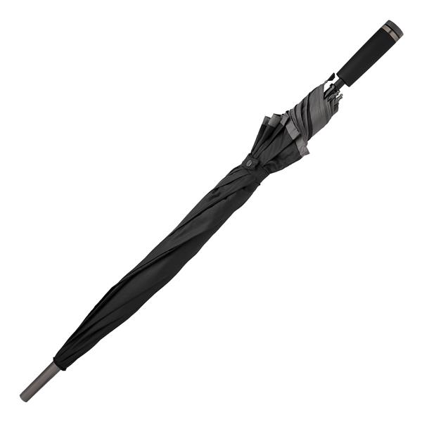 Duża parasolka Gear wyróżnia się nowoczesnym i eleganckim wyglądem. Rączka ma gumowe wykończenie i kontrastuje z kolorowym wykończeniem w postaci pierścienia czy ząbkowanej nakładki przy rączce. Materiał parasola jest dwukolorowy, z subtelną lamówką dla uzyskania wyrazistego charakteru. Ten parasol o dużej powierzchni dobrze kryje przed deszczem. W komplecie z etui na zamek błyskawiczny. Otwieranie/zamykanie jest automatyczne dla zapewnienia optymalnego komfortu. Dostępny w kolorze czarnym.