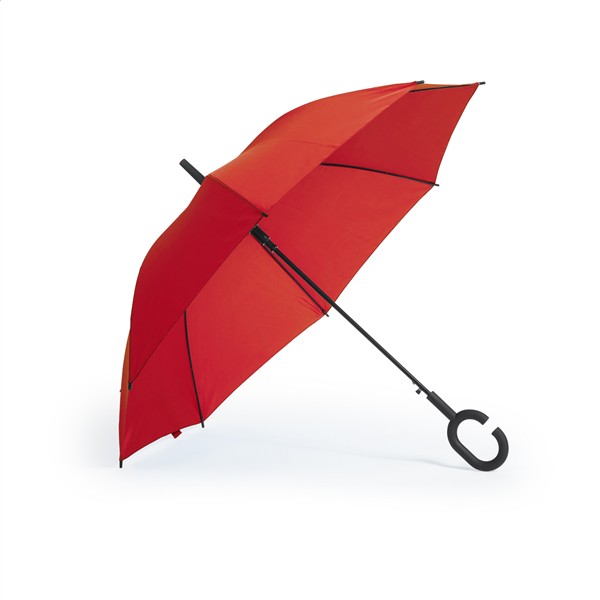 Automatyczny, wiatroodporny parasol z 8 panelami, metalowym trzpieniem i stelażem z włókna szklanego, oraz gumowym uchwytem na ramię. 170T poliester.